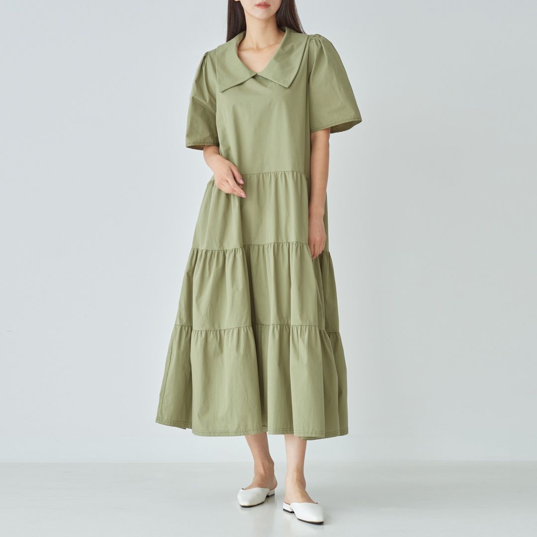 브이넥 라인의 빅 카라 디테일과 어깨에 잡힌 셔링 퍼프로 얼굴이 한층 작아보이며, 러블리한 스타일부터 체형 커버까지 완벽하게 잡아드리는 빅카라 캉캉 롱 원피스