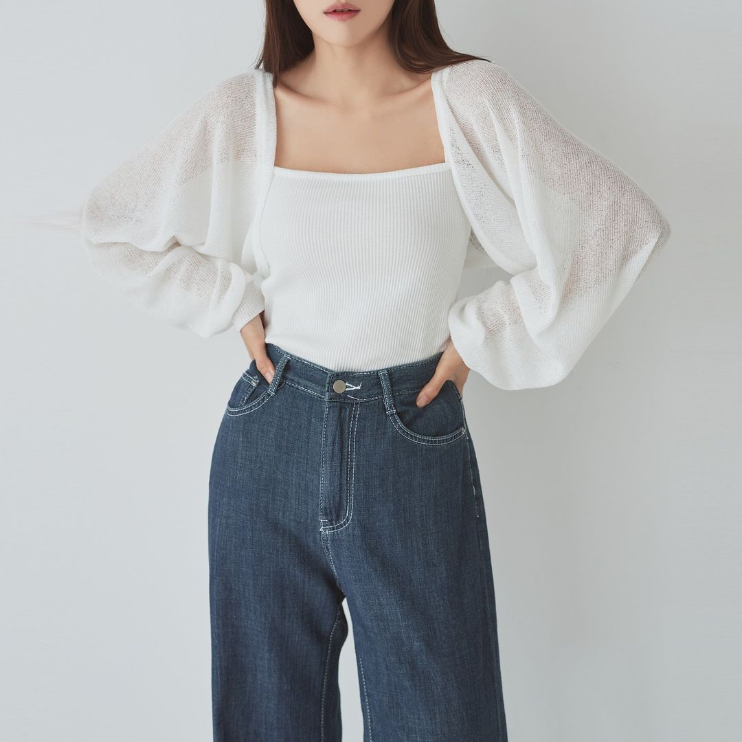 크롭 기장으로 트렌디한 아웃핏을 완성해드리면서, 유니크하면서도 페미닌한 무드로 스타일리시한 코디를 완성할 수 있는 썸머 시스루 볼레로