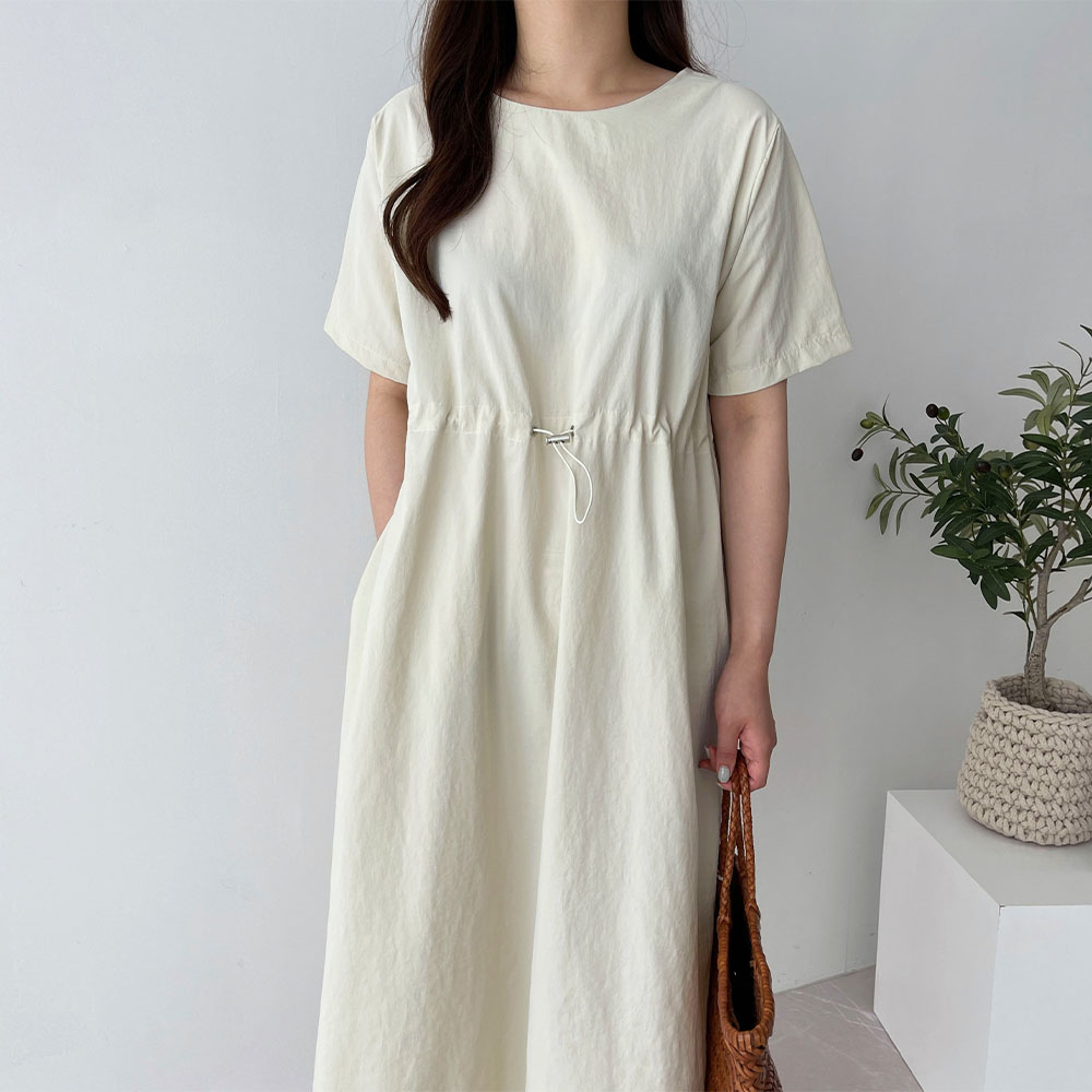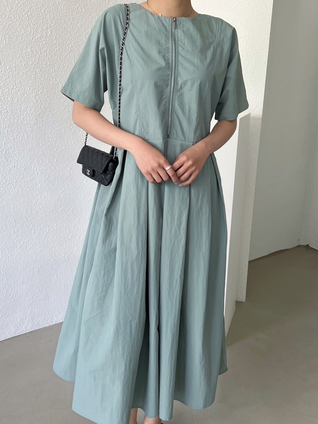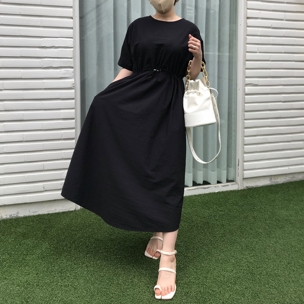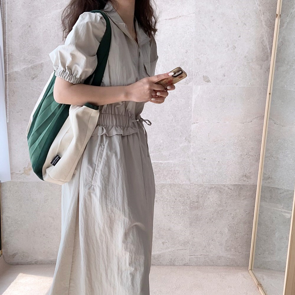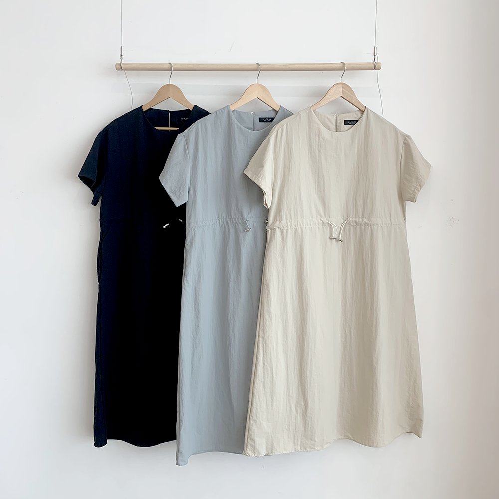 ✔️ 바스락 나일론 배색 집업 스트링 반팔 롱 원피스 (2color) 44반-99