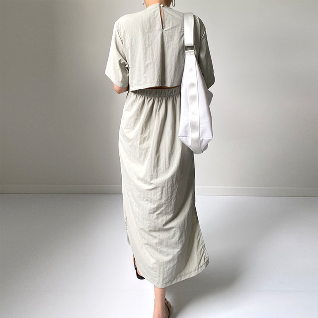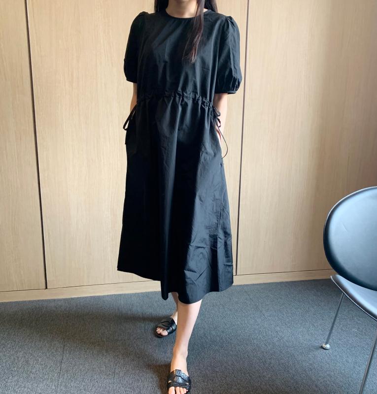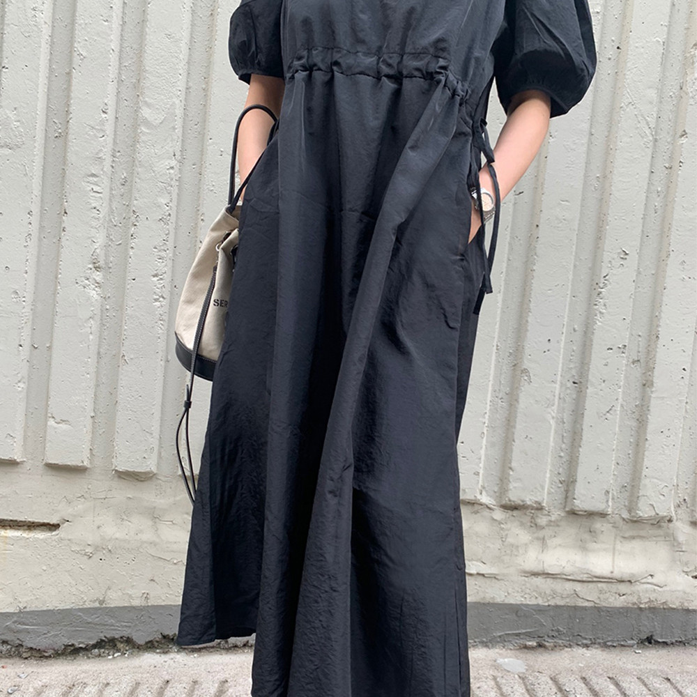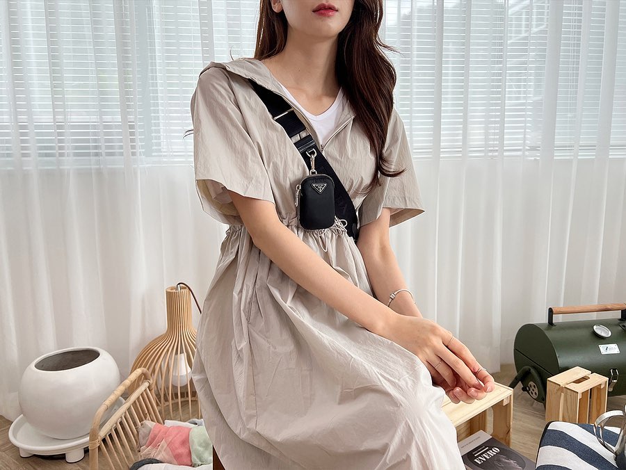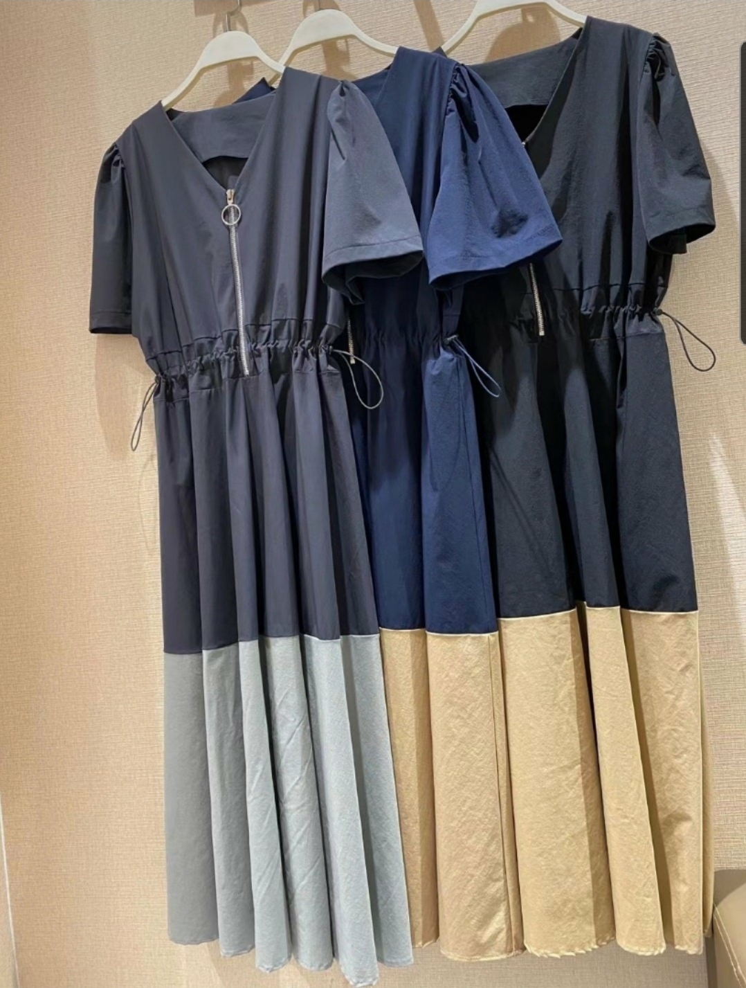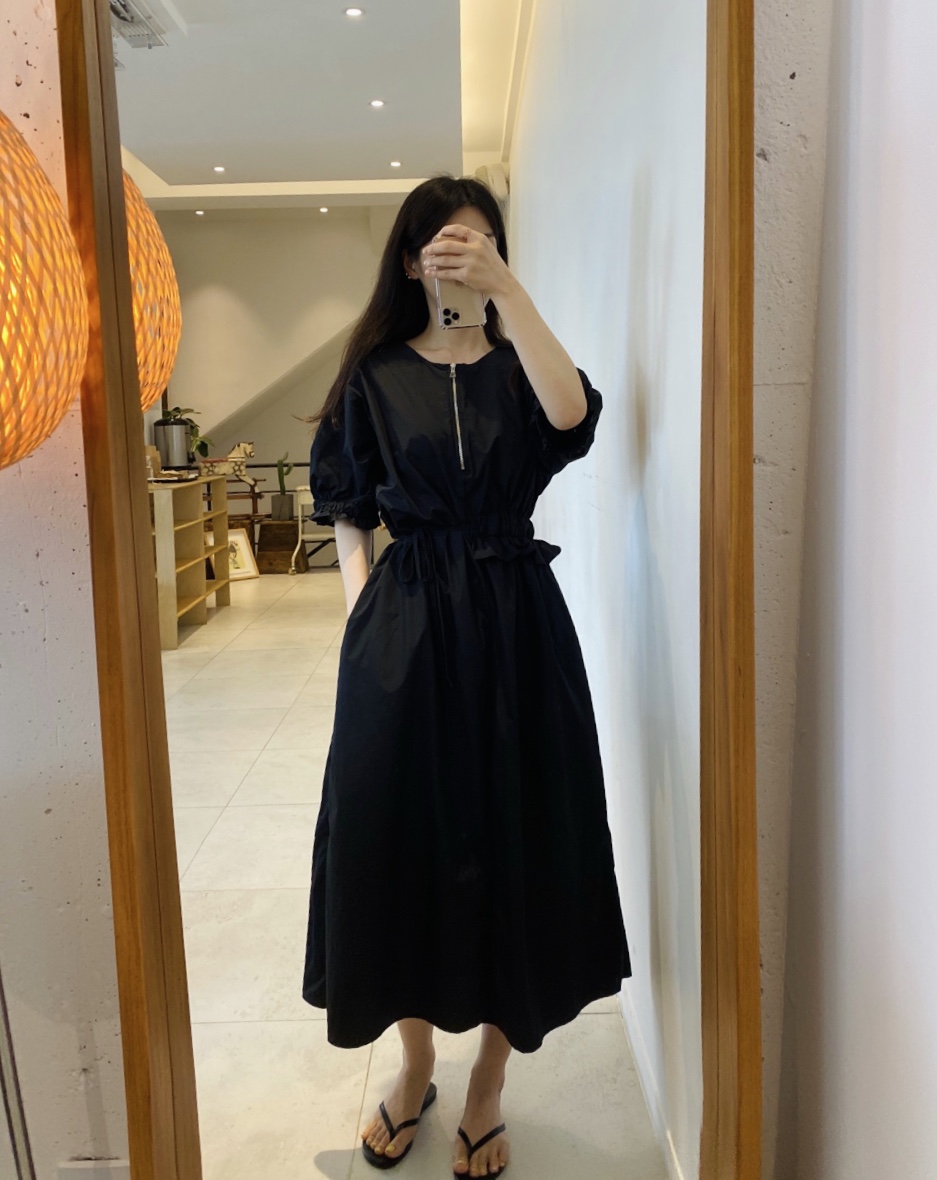 ✔️ 바스락 나일론 배색 집업 스트링 반팔 롱 원피스 (2color) 44반-99