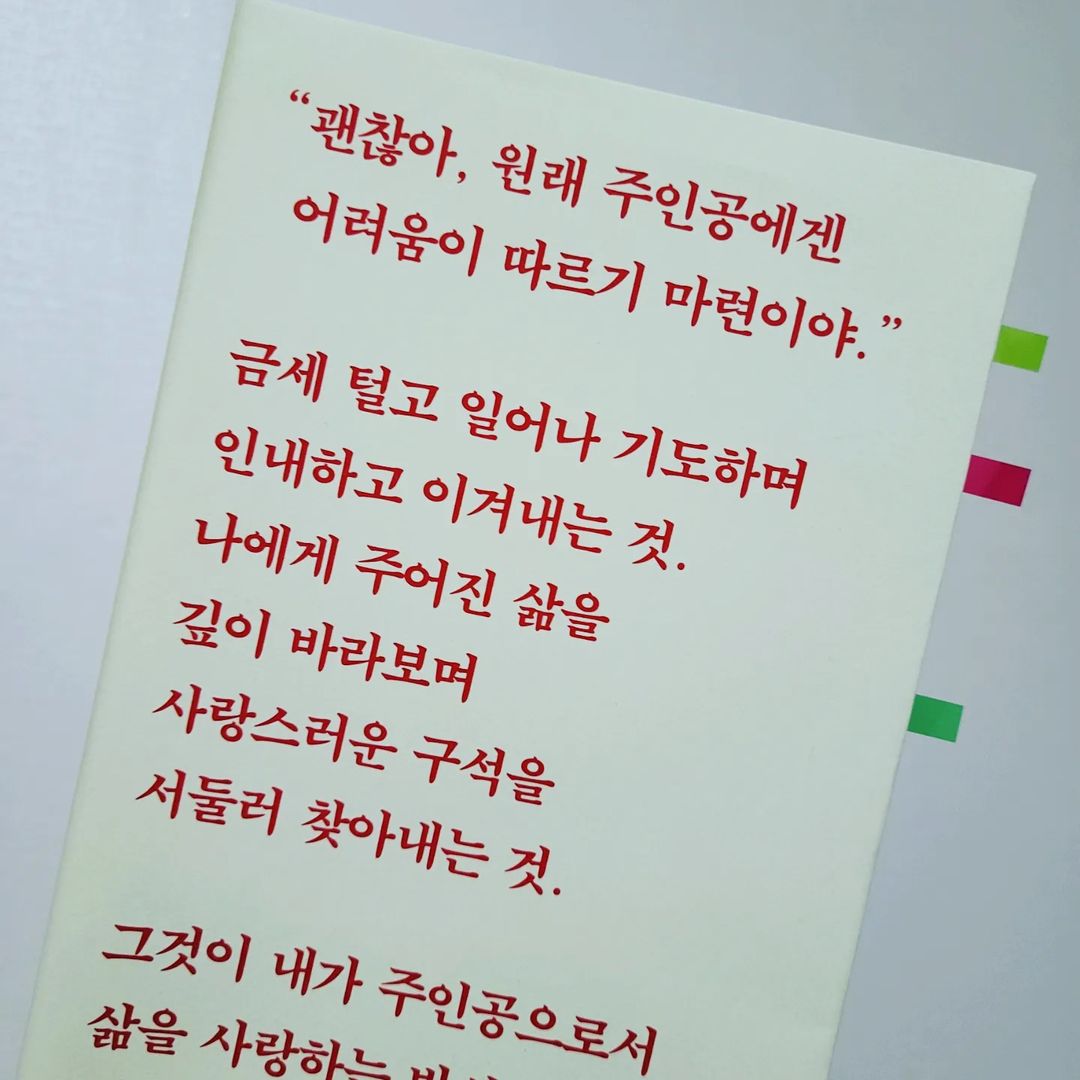 신경 써서 만든 표지 그리고 그 위에 덮여있는 겉지. 왜 덮으셨을까 의문이 들었다. 충분히 그 안에 표지도 예쁜데, 조금 더 임팩트가 필요하셨던걸까? 제목도 상큼 발랄하다. 물음표가 아닌 느낌표라니! 물음표 덩어리 인생 자체인 나는 느낌표를 어디에 두고 살아온걸까!