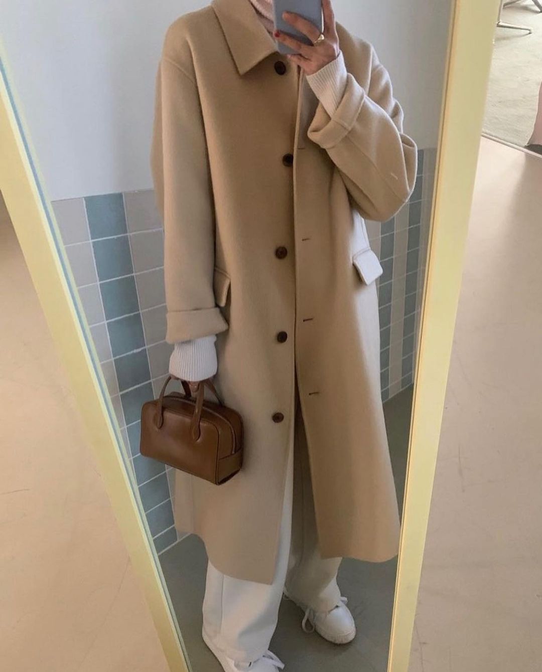 두번째 핸메💛💛 유행타지 않는 디자인에 색감이 너무x100 예쁩니당..✨ 따뜻한 버터 컬러🧈💛 요 핸메도 당연히 가볍구요! 벨트도 있어서 묶어서 입는 거 좋아하시는 분들도 만족하실🥳 매장에 디피 해놨더니 반응 짱 🫶🏻