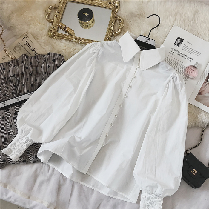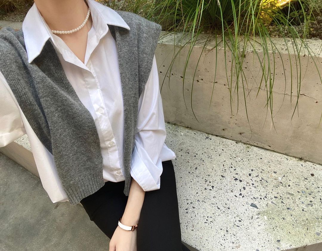 원피스에 어울리는 화이트블라우스엔 진주 단추가 달렸네요.