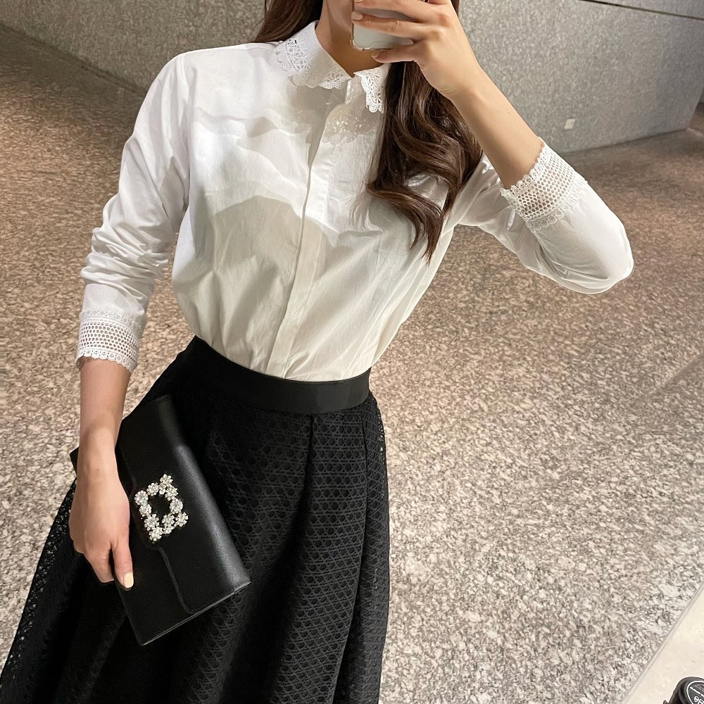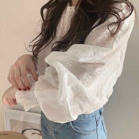 사랑스러운 펀칭의 디테일이 카라넥과 소매단에 포인트 되어져 있으며, 페미닌한무드 우아한무드로 연출 가능 사계절 시즌 다양하게 코디 연출이 가능한 블라우스예요 ♡ ! 지금 시즌에는 가디건이나 니트에 걸쳐 입어도 예뿐 🫶🏻