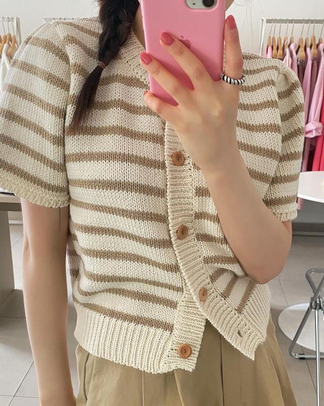입었을 때 시원한 촉감의 탄탄한 니트 반팔 가디건🤎 로투스같은 색감에 단추까지 깔맞춤,,🍪 어깨부분 셔링 살짝 잡혀있어서 더 귀여워요🫶🏻