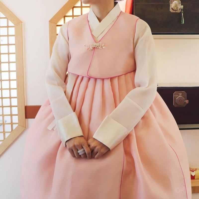 맑은 연분홍빛 배자와 치마의 단아한 한복.