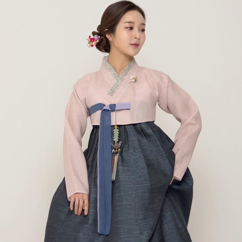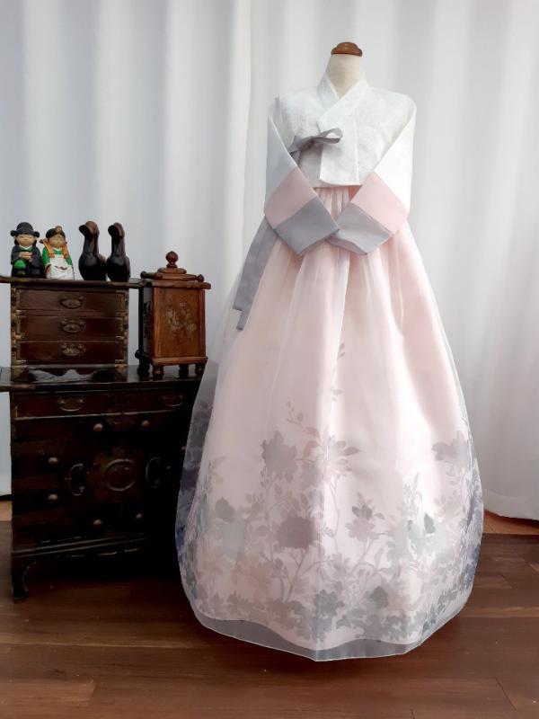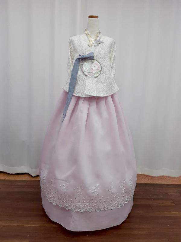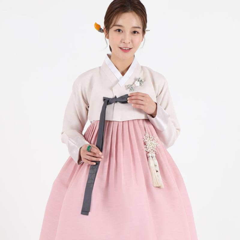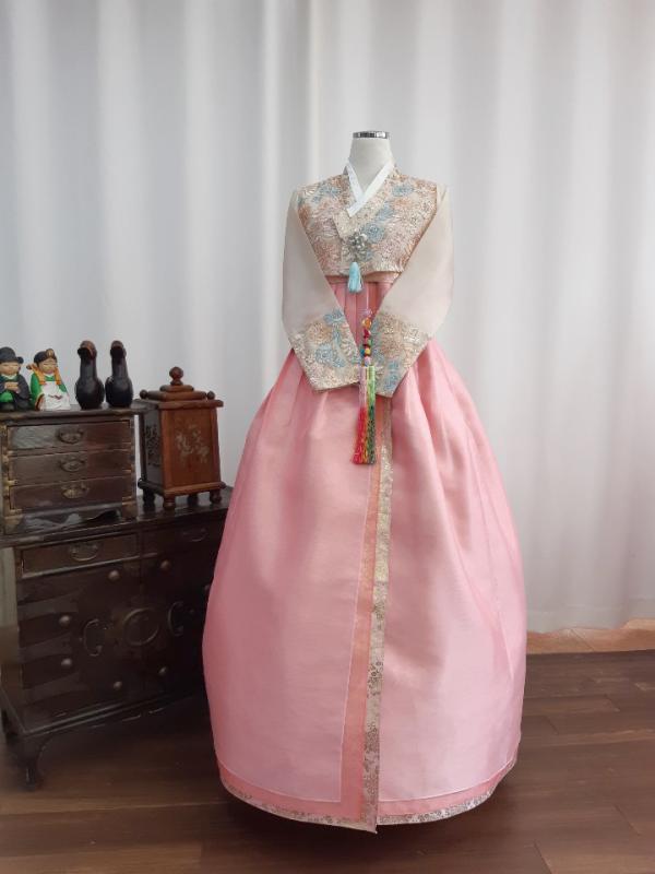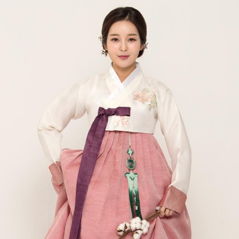 광채 가득 머금고 있는 톤다운 된 핑크 저고리와 빛나는 크림색 치마