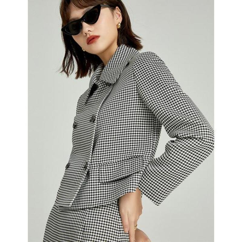 더블 브레스트 버튼 재킷으로, 엣지 있게 테일러링된 실루엣으로 고급스럽고 세련된 스타일입니다.
