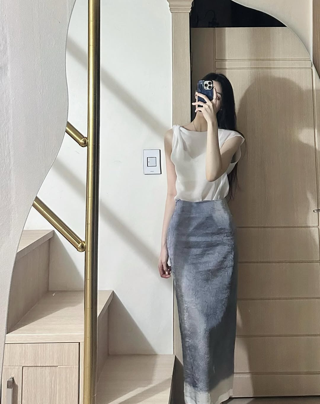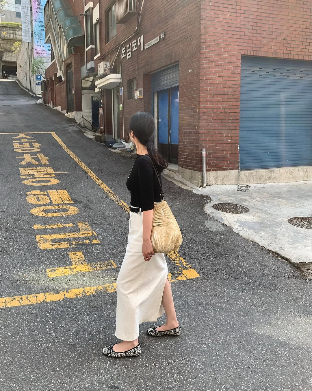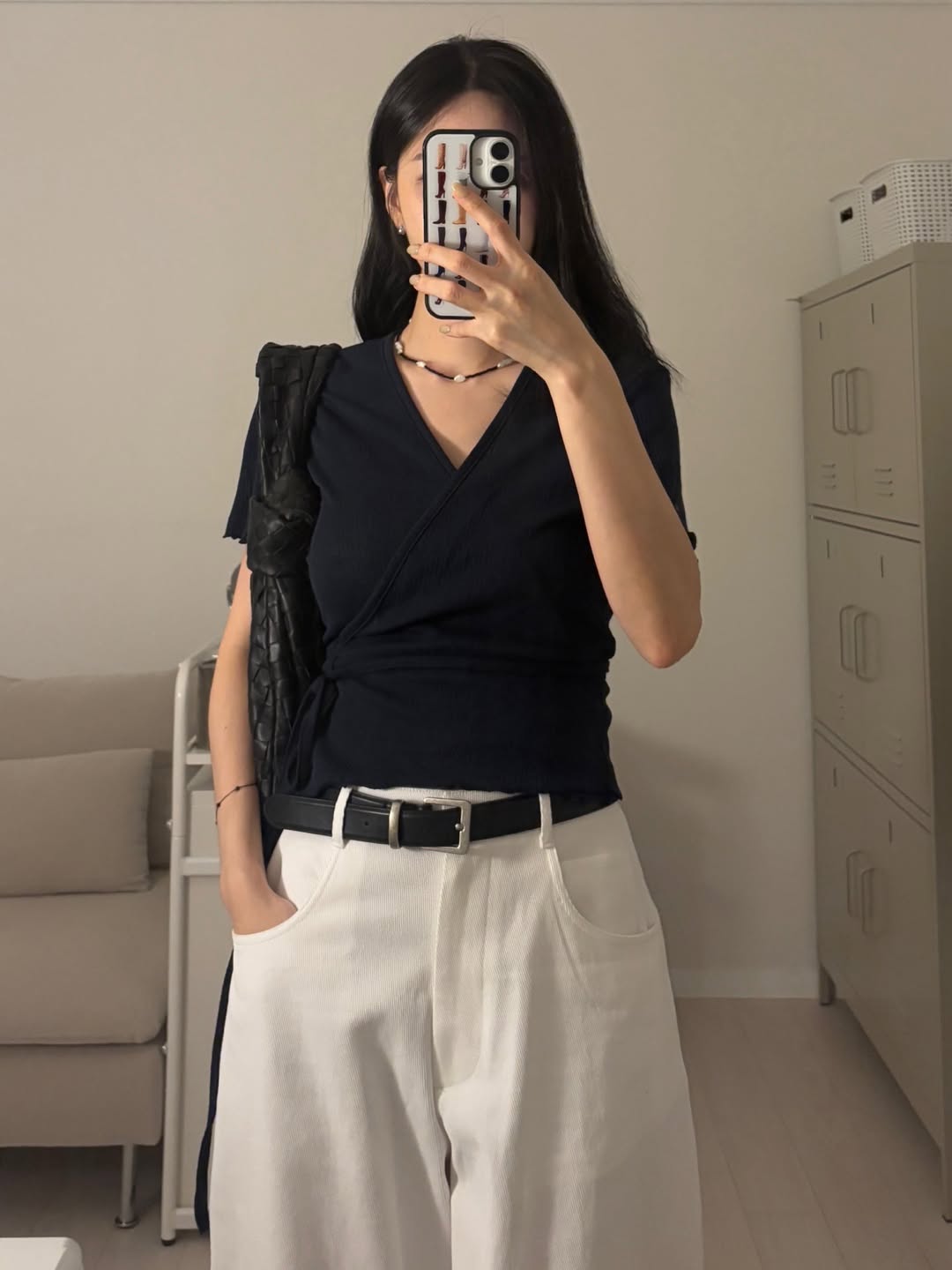 그리고 얼마 전에는 시원하고 하늘하늘한 소재감이 너무 마음에 들었던 누아누 팬츠와 함께 입었는데, 이 탑의 매끈한 디자인 덕분에 바지 컬러와 찰떡같이 어울리더라구요. (사실 전 피드에서도 이 탑을 입어서 살짝 민망했다는 건 비밀..🤫)